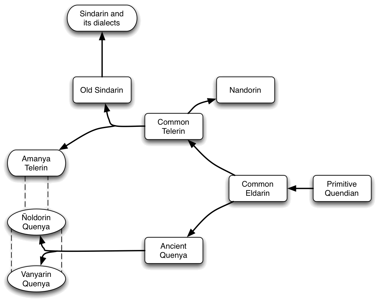 The differences between Vanyarin and Ñoldorin are very few, so that both can be counted as dialects of Quenya. They share for example the same shift b > v (said to be begun by the Vanyar) and the noun plural marker -r (introduced by the Ñoldor) (PM:402), both absent in Common Telerin, so that the Vanyar and Ñoldor must have shared a dialect of Common Eldarin as well, called ’Prehistoric Quenya’ in the diagram above.