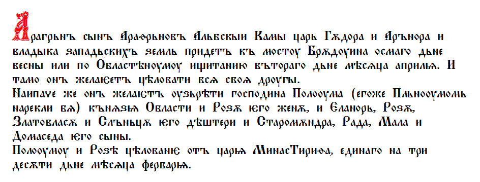 Арагрьнъ сынъ Араѳрьновъ Альбскыи Камы царь Гѫдора и Арънора и владыка западьскихъ земль придетъ къ мостѹ Брѫдѹина осмаго дьне весны или по Областѣнѹмѹ ищитанию вътораго дьне мѣсѧца априлѩ. И тамо онъ желаѥетъ цѣловати всѧ своѧ дрѹгы. |