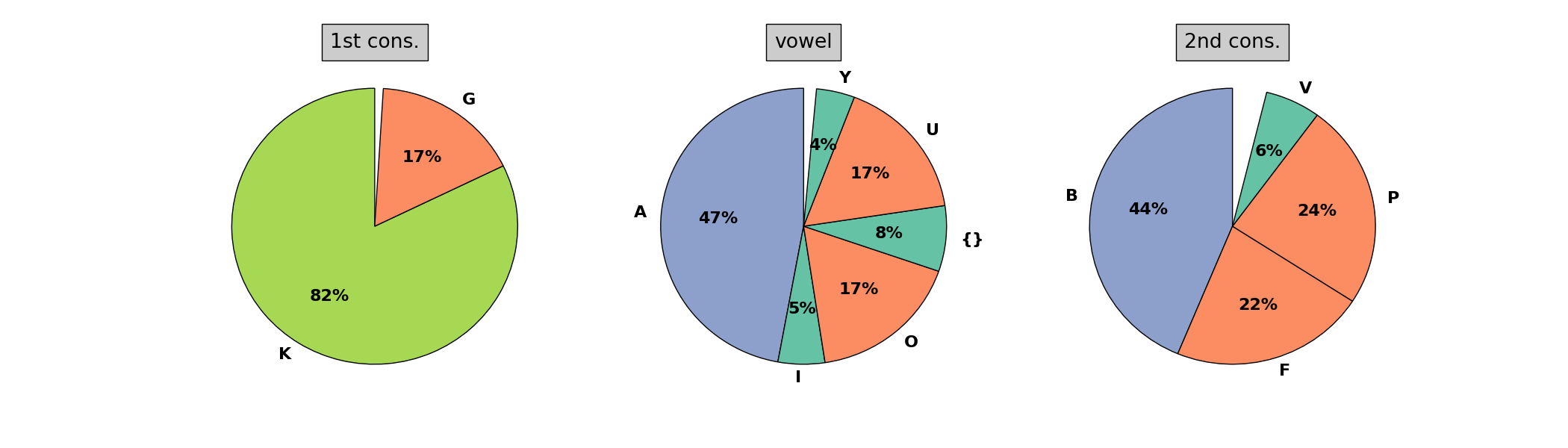 Having brought Cohen’s data in digital form, it is possible to generate some statistics about sound distributions. To simplify things across different phonologies, I put similar sounds in groups: For the first consonant, all voiceless stops are represented by K, voiced by G and voiceless fricatives by H. For the vowel, I use the obvious notation A, E, I, O, U for the five common vowels, Y for [y] and empty curly brackets in the case of a schwa, an unknown vowel (as in Middle Egyptian) or no vowel at all. For the second consonant, the possibilities are P, B, F, V, M and MP/MB for a nasalized cluster. This gives the following distribution (values below 3% are suppressed):