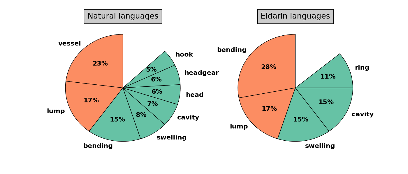 Here we can see a lot of differences. While vessel is the most common semantic field in natural languages, it is almost not represented in Elvish, occurring only in the words Q. kalpa, N. calf ‘water-vessel’. The two most common fields in Elvish are bending and lump, which are also common in natural languages. On the other hand, cavity and swelling are noticeably more common in Elvish. It would appear that all of this simply reflects Tolkien’s taste, his own association with the kup/korb sound shape.