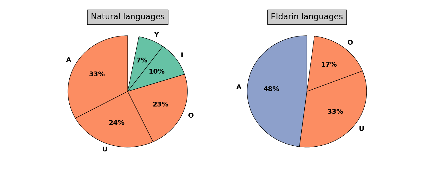 I do not think that much can be said about the distributions of the consonants: The commonness of K probably just reflects its relative commonness compared to G or H in the languages involved. The high frequency of V in Elvish is clearly due to the Quenya shift of [b] > [v], and so on. However, looking at the distribution of vowels, one finds the same pattern as in Cohen’s data: While A is the most common vowel, E almost does not appear at all and I only very little. Here, one can make a quantitative comparison to the rank-frequencies of Elvish vowels. For Sindarin (including the Noldorin of the “Etymologies”), I have calculated them directly [4]; for Quenya only in initial and final position in conjuncture with consonants [6] (using a list of words from the “Etymologies” only). The latter two actually give similar results and thus should be a reasonable approximation: